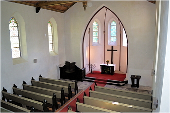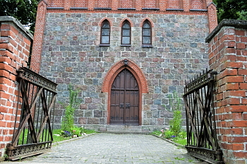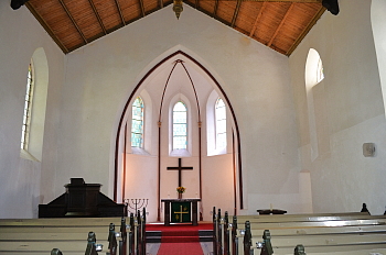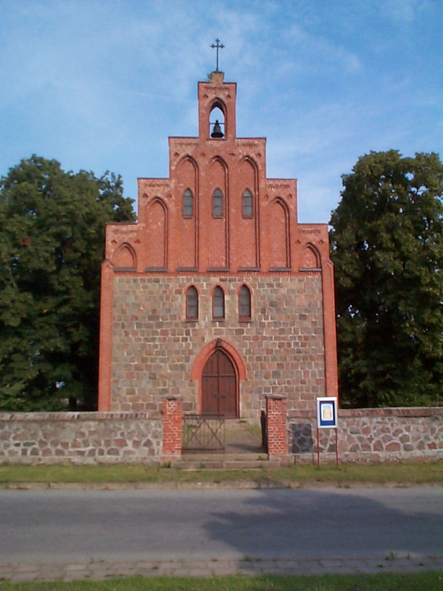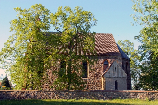 Nach Osten und Westen befindet sich je ein Treppengiebel mit Blendengliederung. Die Kirche hat spitzbögige Fenster- und Türöffnungen mit spitzbogigen Westportal, das Innere der Kirche ist glatt verputzt. Die Chorpolygon sind gewölbt mit spitzem Triumphbogen, im Schiff mit offenem Dachstuhl. Die Kirche ist von einer Feldsteinmauer mit Eckpfeilern in Backstein umgeben. |